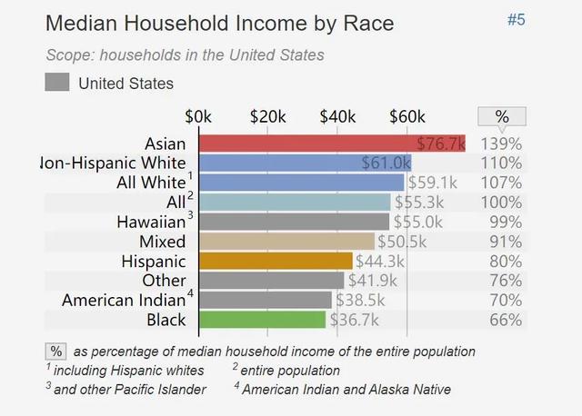 另外更有一个代表性的例子就是拉丁裔,拉丁裔多来自墨西哥、古巴,这些都是有名的穷国,而且拉丁裔来美国时很多人不会英语,只会西班牙语,存在语言障碍,黑人60年代的处境再差也比他们好得多,但如今拉丁裔的平均收入、财富却都高于黑人,犯罪率和单亲家庭比例也都比黑人低。