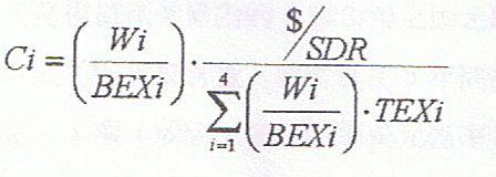 确定篮子里每种货币的组成单位数(各币别含量)的基本公式如下:
