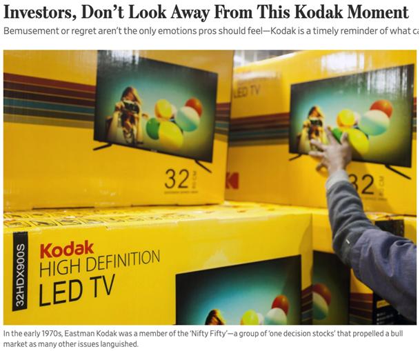 柯达1983年在全球拥有超过12万名员工,并于1975年发明了数码相机。1997年,柯达的市值就接近300亿美元。1930年~2004年,柯达一直是道琼斯指数的成分股,还一度成为基金经理被动持有的个股。然而,发明数码相机的柯达未能抵抗住手机带来的冲击,公司于2012年宣布破产。