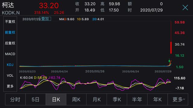 周三美股开盘后不久,柯达股价一路飙升,盘中触发20次熔断,一度暴涨572%报60美元,截至收盘,收于33.32美元,涨幅318.14%,市值14.5亿美元。