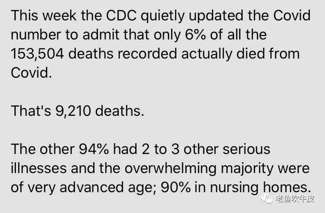 更重要的是,这6%确定只因为得了新冠肺炎死的人里面,还有90%的人是老人院里的。