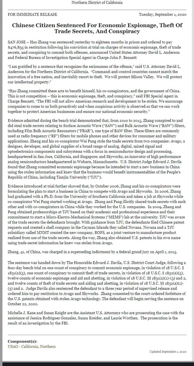 9月1日,美国联邦法院作出最终判决:中国芯片领军人物、天津大学教授张浩被判18个月有期徒刑,罚款47.7万美元(约330万人民币)。