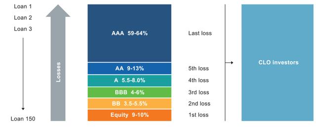 要理解其中的原因,我们来看看华尔街是如何创建CLO的。CLO是固定收益证券的一个花哨名字,由大约250个高级有担保的银行贷款组成。使用瀑布结构,CLO经理将贷款打包成具有不同特征的“部分”。处于资本结构顶端的部分最先获得现金,最后承受损失,但收益最低。你在这个链条上走得越低,你承担的潜在损失和风险就越大,但回报率就越高。通过创造无限复杂的金融产品,投资者关注的是有吸引力的收益率,而不是隐藏在表面之下的可疑资产。