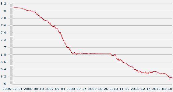 自2005年7月21日人民币汇率改革以来,人民币汇率基本上维持不断升值的走势。2006年5月15日,汇率中间价首度突破1美元对8元人民币。2007年1月11日人民币对美元7.80关口告破,同时贵过港币。2008年4月10日人民币中间价破7.0大关。