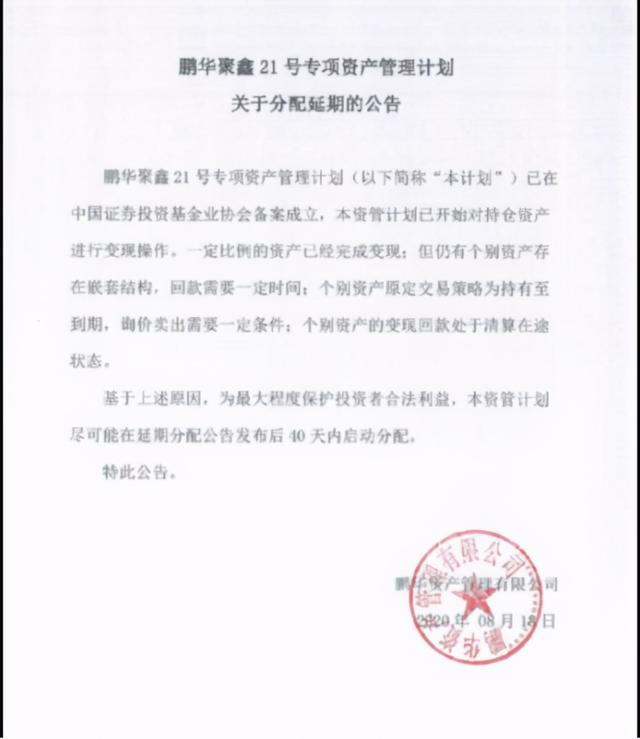 到了今年8月14日,鹏华资产也发布了产品提前终止公告。公告称:“根据资管新规的要求,综合考虑聚鑫系列产品的整体管理,本资管计划拟提前结束。本公司作为资产管理人会充分考虑底层资产的流动性匹配问题,妥善予以处理,最大程度保护投资者合法利益,本计划最晚于公告出具之日起30天内完成分配。”