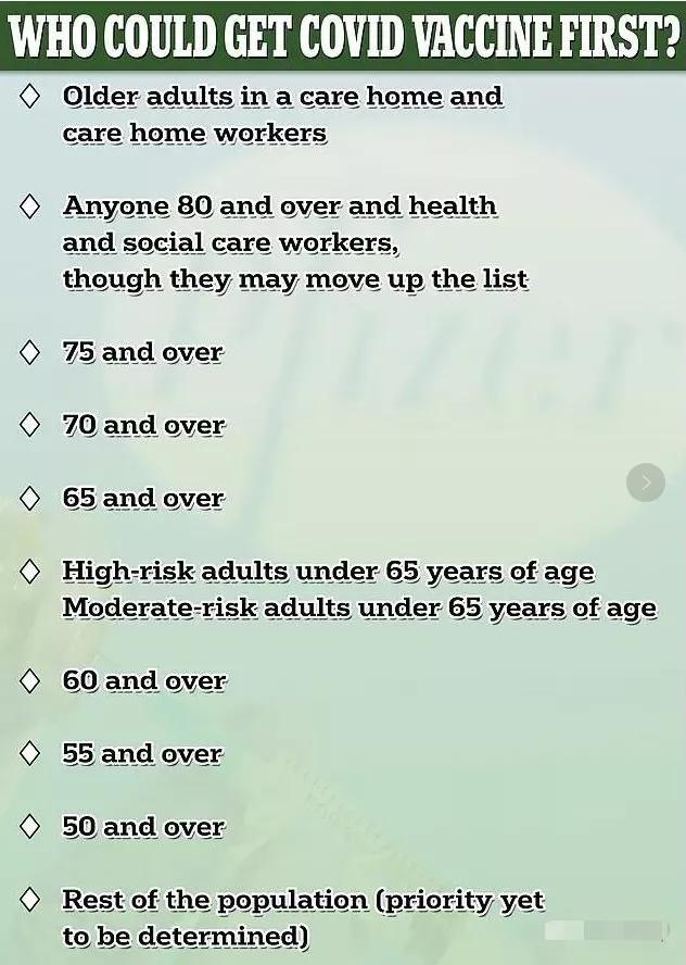 3月或4月初,将有足够的疫苗供所有美国人使用。最脆弱的人群将在12月前接种疫苗,医护人员将在1月前接种疫苗。