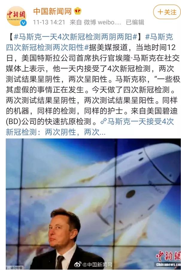 今天,特斯拉CEO马斯克在社交平台发布消息称,进行了四次新冠病毒检测,结果两次阴性,两次阳性。引发人们对美国确诊1000万的质疑。