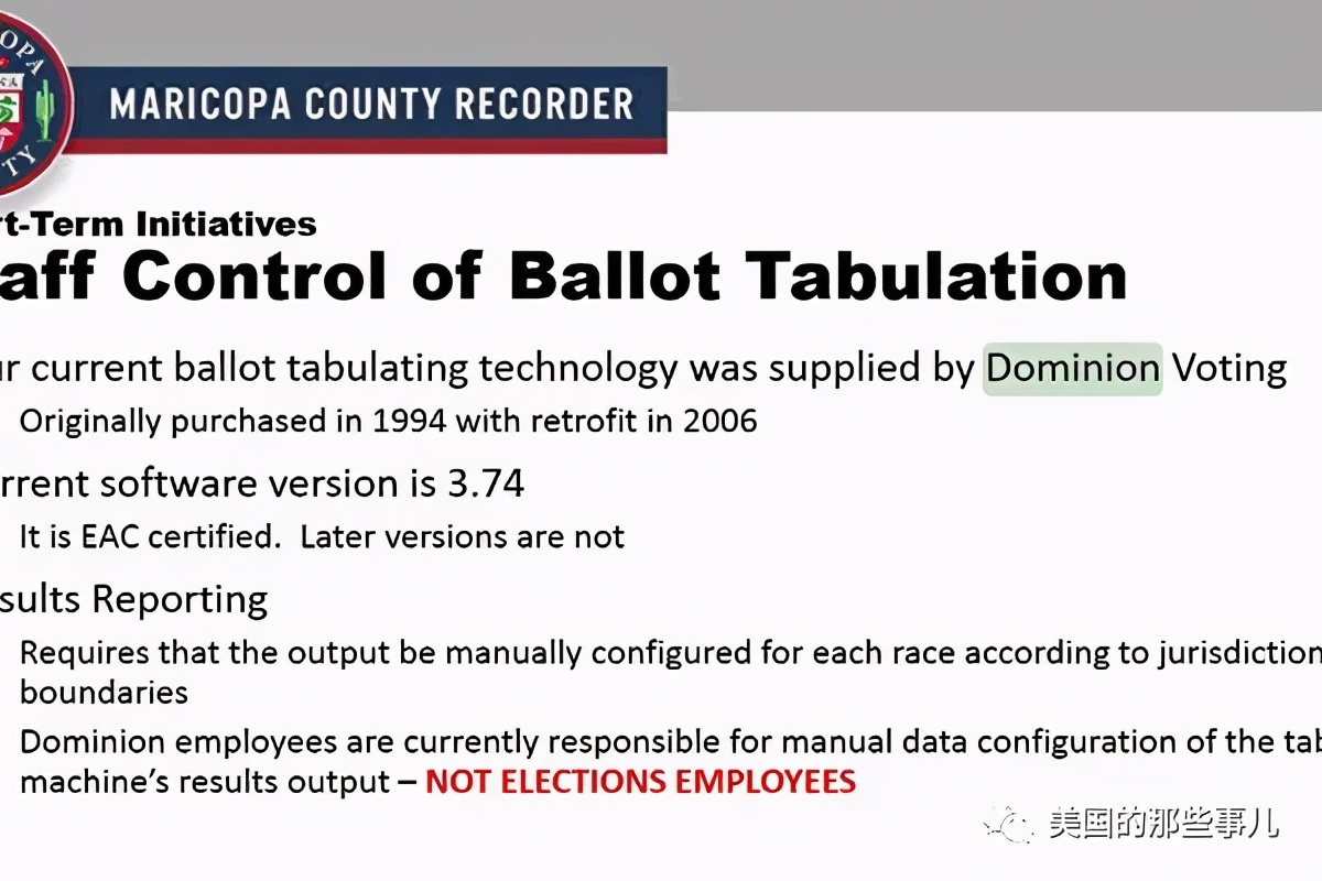 此外在亚利桑那州的Maricopa县,一份2017年的官方文件显示,“我们的选票制表技术由Dominion投票系统提供结果报告:Dominion员工目前负责制表机结果输出的手动数据配置——非选举员工。”