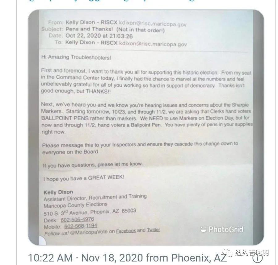 3、亚利桑那州民主党安排作弊事宜的电子邮件被曝光,Maricopa选区选举副主任在邮件中说,在选举日当天必须保证使用sharpies笔,因为机器会自动作废用该种笔填写的选票。该区的川普支持者远远多于拜登支持者。