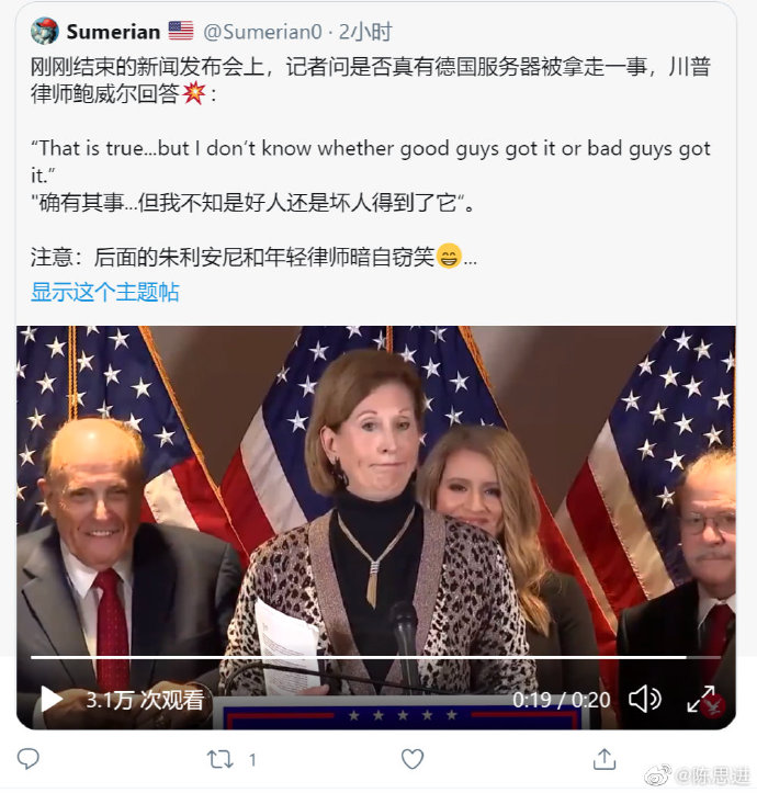 发布会上还有一个花絮,有记者问鲍威尔大律师关于德国服务器的事情是否属实,鲍威尔回答说:“确有其事,但我不知道是好人还是坏人得到了它。”站在后面的朱利安尼和年轻女律师闻言笑的好开心。
