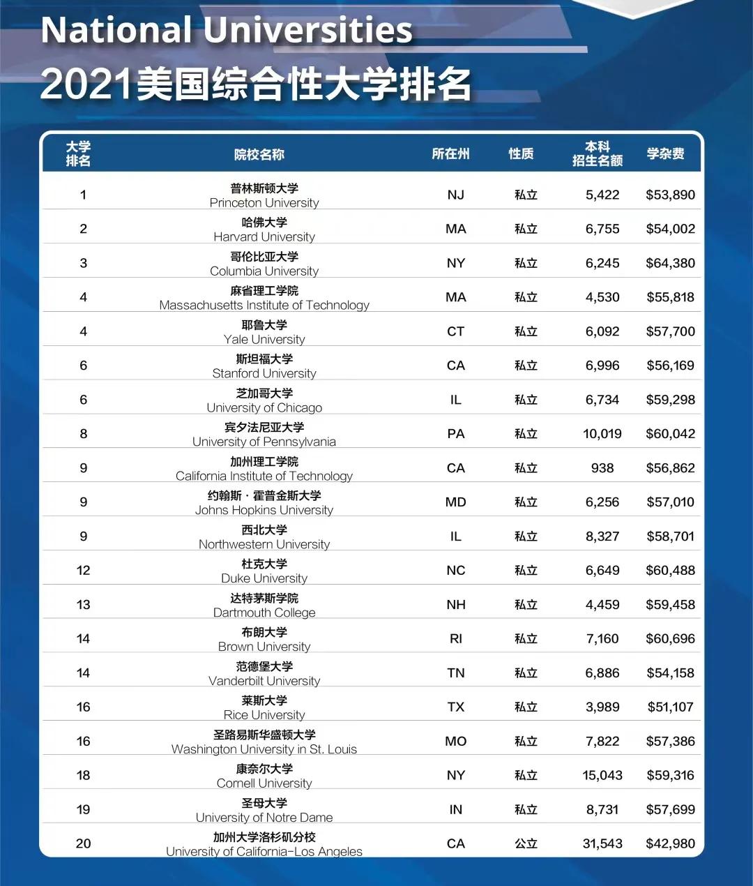 2、美国大学2021年最新排名