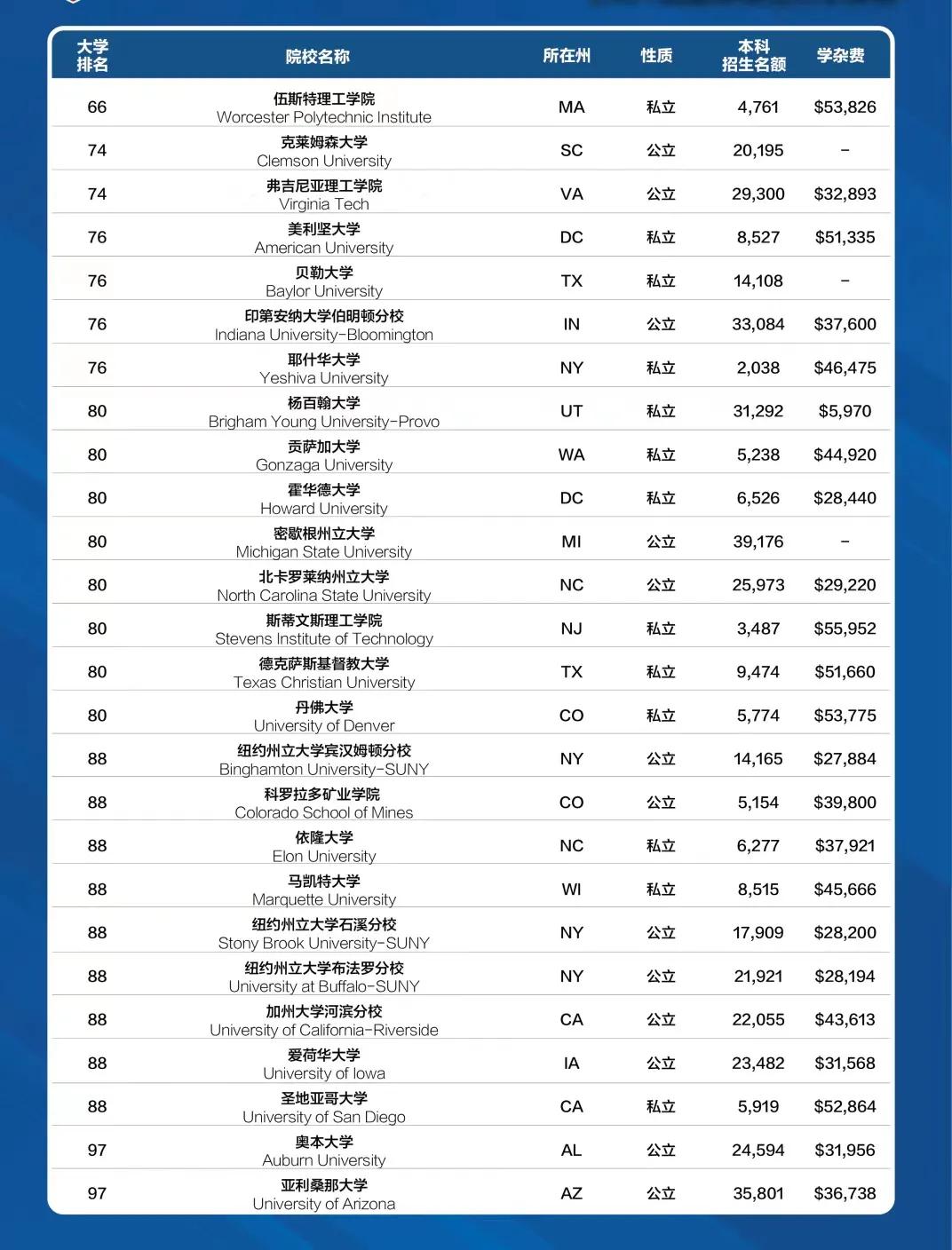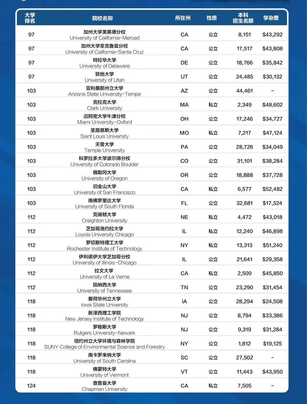 迈阿密大学上升8名,从第57位上升至了第49位;奥本大学和犹他大学同时上升了7位,冲进了前100的榜单中,一同跃至第97位。
