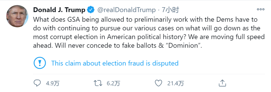 (思进注:周一,美GSA总务局长墨菲给拜登发函,美国主流媒体解读为她承认拜登为大选赢家,并通知他开始过渡程序;继而川普发推,又被解读为承认败选。其实,GSA的公开信、川普的推都写得清清楚楚,并不是那个意思(下面是川普最新的推)。再转发下文,和大家分享……)