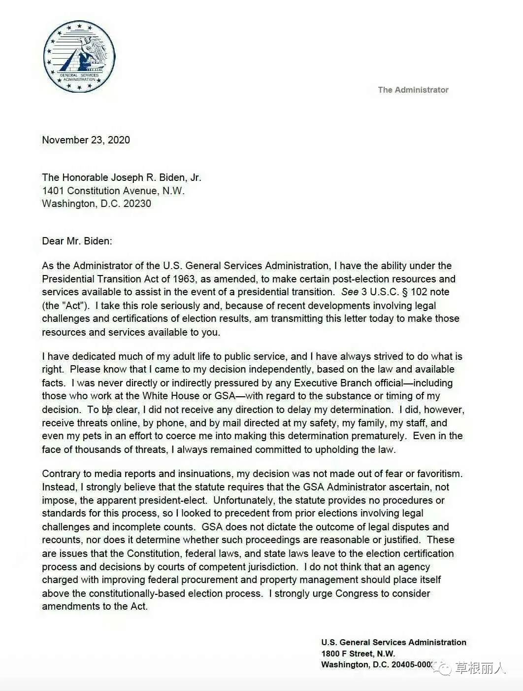 拜登过渡团队曾威胁要采取法律行动,指责GSA未能为新一届政府提供支持,威胁国家安全,妨碍了抗击冠状病毒大流行的准备工作。有些左派人士还威胁她和她的家人。