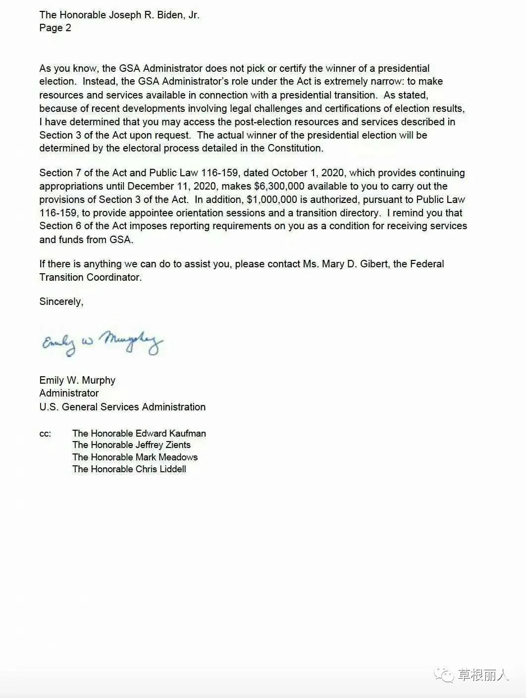 但我在墨菲女士的这封信里找不到她承认拜登当选的任何结论。因为信中明确说: