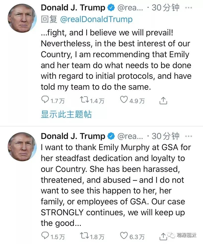川普说:我想谢谢总务局的墨菲,她具有坚定不移的奉献精神,对国家忠心耿耿。她一直受到骚扰、威胁和欺负。我真不想看到这一切发生在她、她的家人和总务局的员工身上。我们的案子将坚定地打下去,我们将继续(因为推文字数受限必须分断)战斗,我相信我们将取得斗争的胜利。无论如何,出于国家最优利益,我建议墨菲和她的团队按照原来的规程做该做的事,我一直告诉我的团队这样做(指的是按照规程办事)。