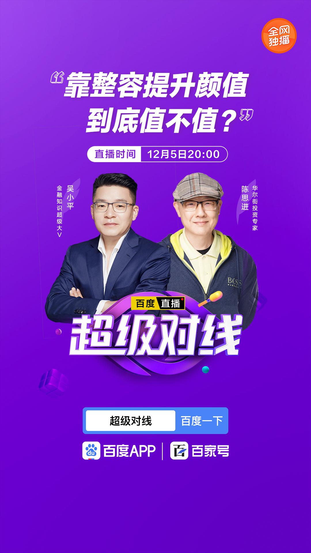百度#超级对线#直播节目在12月5日做了一期节目,叫“医美整容值不值”。邀请的嘉宾一个是在华尔街金融专家陈思进,一个是财经知识大V吴小平。陈思进认为整容“不值”,而吴小平则认为“值”,两人为此展开辩论。