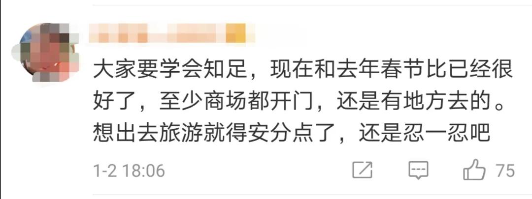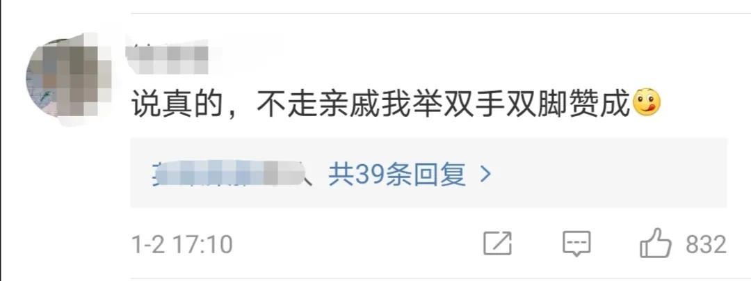 对此网友们也纷纷表示,“不乱跑,家里蹲希望新的一年一切顺利”“今年春节老老实实待在家里,哪儿也不去了!”“说真的,不走亲戚我举双手双脚赞成”……