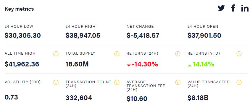 此前,在截至北京时间周一傍晚18点25分,比特币于24小时内迅速跌破4万至3.3万美元数道关口,相当于抹去之前五天的全部涨幅。美股盘初比特币继续下跌,并跌破3.1万美元。