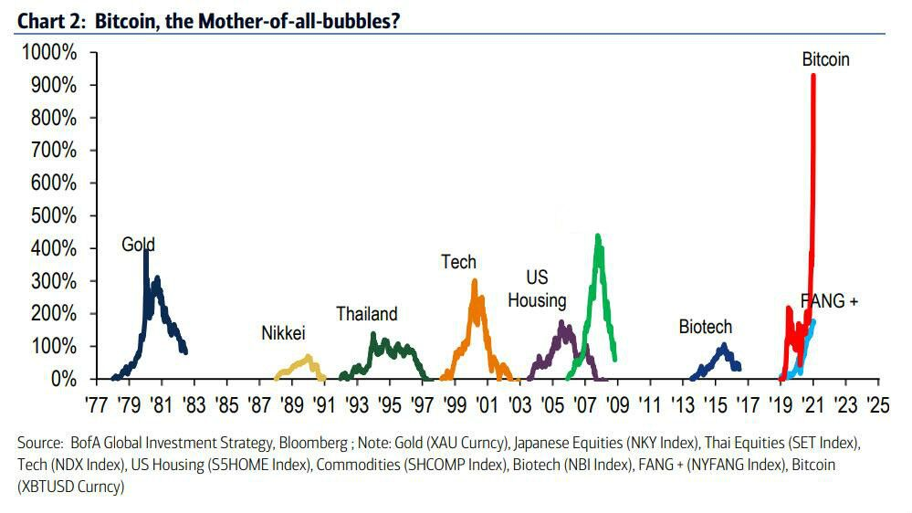 如果我们将最近这几十年来的泡沫进行可视化,毫无疑问,比特币就是“泡沫之母”。