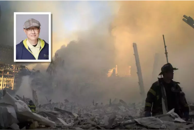 前華爾街美銀證券副總裁陳思進(左上小圖)說,911對他是「壞事變好事」,讓他提前20年實現了作家夢。(圖片合成,取自美聯社)