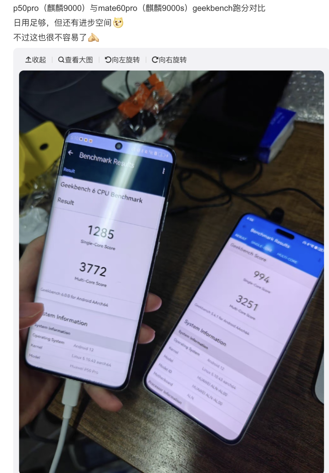 首先,麒麟9000s和之前台积电代工的9000之间跑分有显著差异,9000s和9000比geekbench6,单核与多线程分数均低于9000,但9000s的架构领先9000一代且芯片面积还大得多,跑分应起码有10%的提升(9000s的A710架构对比9000的A77),但实际跑分仍有差距这说明是制程工艺拖后腿了,这也证明9000s不是台积电5纳米工艺,不是存货。