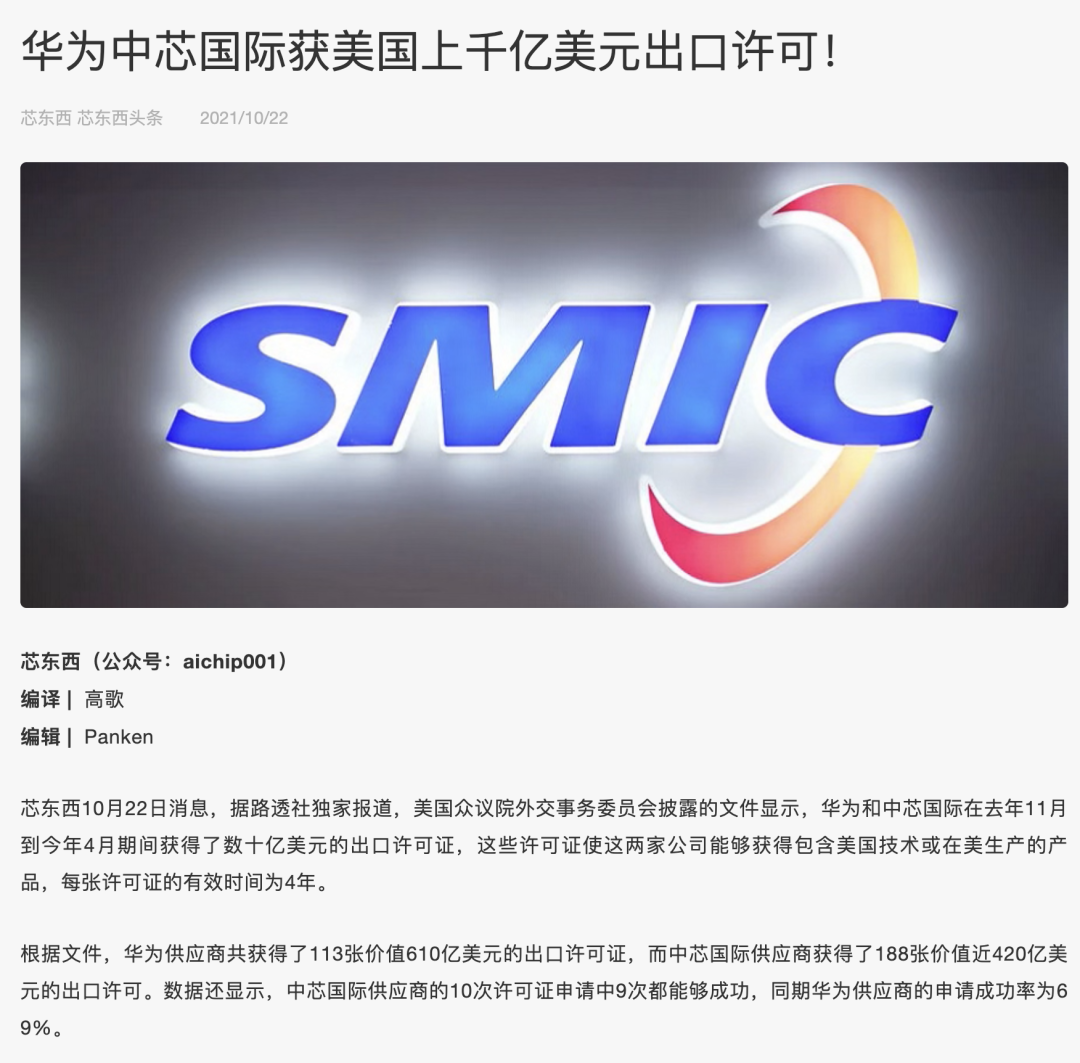 另一方面,Mate60的5G芯片则大概率来自于制裁后申请到的许可证,早在2021年10月,路透社报道美国众议院外交事务委员会披露的文件显示华为和中芯国际在2020年11月到2021年4月期间获得了大量出口许可证,这些许可证使这两家公司能够获得包含美国技术或在美生产的产品,每张许可证的有效时间为4年。根据当时的文件,这期间华为供应商共获得了113张价值610亿美元的出口许可证,而中芯国际供应商获得了188张价值近420亿美元的出口许可。数据还显示,中芯国际供应商的10次许可证申请中9次都能够成功,同期华为供应商的申请成功率为69%。