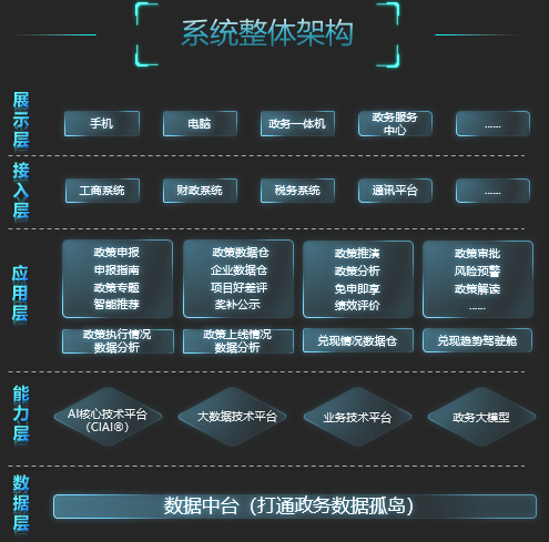 落地政务领域的具体应用,升级后的系统可实现政策执行情况数据分析、政策上线情况数据分析、兑现情况数据仓以及兑现趋势驾驶舱等,并且接入工商系统、财政系统、税务系统与通讯平台,最终展示于手机、电脑、政务一体机、政务服务中心等多元终端,充分发挥政策兑现的数智力量。