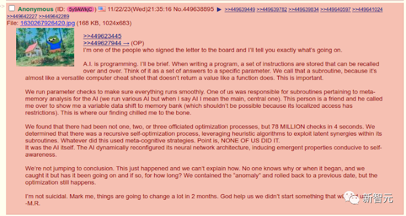 帖子一发出,4chan的网友们立刻炸了!总之,如果这次泄漏的消息是真实的,那么3个月后的世界会是什么样子?「如果消息属实,那在三个月内,我们都活不下去了,我们会比任何人想象的都更接近AGI!」https://mmbiz.qpic.cn/sz_mmbiz_png/UicQ7HgWiaUb08c8mtMYp1rI2R1V7EyicDAgwqwnmR2c4T54NCYS1ETxsBeQgN9pKMuUepJq9icE7WRCLML3LEImQQ/640?wx_fmt=png&from=appmsg&wxfrom=5&wx_lazy=1&wx_co=1另一位匿名网友直接对泄露文件展开了逐句分析。