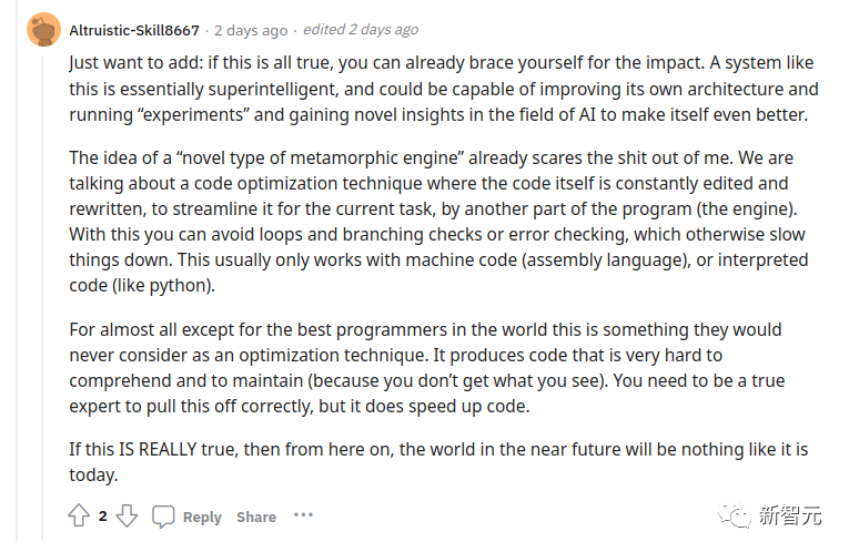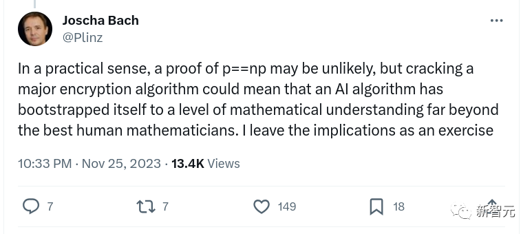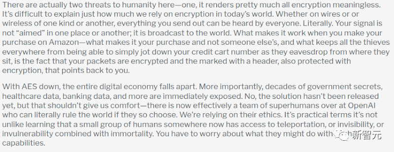 在看到泄密文件后,11月25日,一位博主怀着激动的心情,写下了这个帖子——《世界即将发生剧变,却没人意识到这一点》。https://mmbiz.qpic.cn/sz_mmbiz_png/UicQ7HgWiaUb08c8mtMYp1rI2R1V7EyicDAhbDnADPSib98dBSibnn2qOGGcYR4W1CesKTvzRo7SQEMHW6H3iaQY3FXw/640?wx_fmt=png&from=appmsg&wxfrom=5&wx_lazy=1&wx_co=1博主表示,自己是从80年代中期就开始写软件的那一批人。ChatGPT是有史以来最具爆炸性的软件,1亿用户几乎在一夜之间使用ChatGPT,这是有原因的。ChatGPT的用户增长速度比史上任何技术、硬件或软件都快,而OpenAI,正在开发GPT-5。而这,还不是他们在做的全部。最近OpenAI的疯狂事件表明,他们在做的不仅仅是简单地向LLM添加计算。Q*似乎能够解决AES-192和 AES-256的加密问题。这是目前我们拥有的最好的加密方法,能使当前世界的大部分功能保持「安全」。https://mmbiz.qpic.cn/sz_mmbiz_png/UicQ7HgWiaUb08c8mtMYp1rI2R1V7EyicDAAGPcj56U4f4r5ew0et2wByYwq3IhndBE50bzTCQmvPwkhxz3I6tpWw/640?wx_fmt=png&from=appmsg&wxfrom=5&wx_lazy=1&wx_co=1而且,解决方案已经超越了团队的理解范围,OpenAI内部也不明白它的工作原理。这就对人类造成两个威胁——第一,它几乎让所有的加密都变得毫无意义。随着AES的宕机,整个数字经济都会分崩离析。数十年的政府机密、医疗保健数据、银行数据等会立即暴露出来。现在的OpenAI实际上是一个超人团队,如果他们愿意,他们可以真正统治世界。破解、取代AES,或许需要几十年的时间。目前还不清楚加密是否可行,因为破解AES-192和AES-256被认为是不可能的,除非量子计算最终能够做到。但看起来,现在已经有一种智能,在以与截然不同的方式思考,并且经过了最少的针对特定目的的训练。沿着这些思路,存在解决方案的事实似乎在P≠NP推定的脑海中打了一颗子弹(那些伟大的「假定的数学理论之一,以寻找一个证明,如果有人能想出一个,就会有非常有利可图的奖励」)。如果沿用这个思路,或许就存在一个方案,直接否决了P≠NP。如果泄漏是真实和准确的,似乎就证明了P=NP——我们作为一个物种太慢了,无法在人类时间内提出细致入微或更聪明的解决方案。这将使几乎所有的计算陷入混乱,因为它表明,其实实际上并没有加密这样的东西存在;一切都只是误导——机器比人类更不容易受到这种误导。除此之外,泄密事件还表明,当前的研究实例正在展示元认知能力——从内部角度反思自己的「思维」过程,并提出相当复杂的改变以提高绩效的能力。