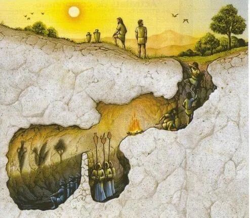 柏拉图《理想国》中有一个洞穴比喻,一群囚徒被关在黑暗的洞里,面对一堵石壁,在他们身后有一个火把,火光照过来,他们面前的石壁出现影子,囚徒们以为这就是光的真相。