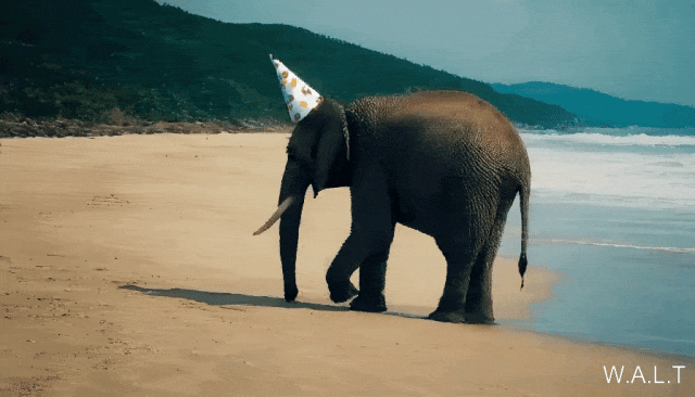 elephant wearing a birthday hat walking on the