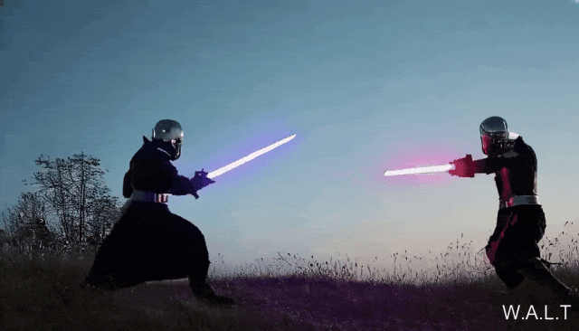 slow motion/两个骑士用光剑决斗,电影动作镜头,极其慢动作