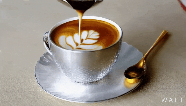latte art into a silver cup with a golden spoon next to