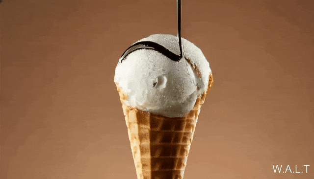 chocolate sauce over vanilla ice cream in a cone, studio