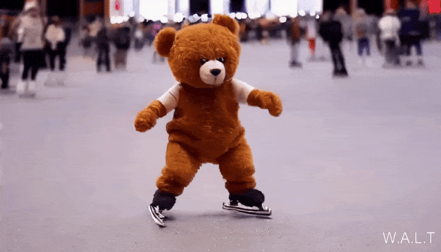 Teddy bear skating carefully in Times Square,Slow