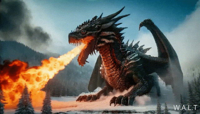 fire/一条巨大的龙盘踞在冰雪覆盖的大地上,喷吐着火焰
