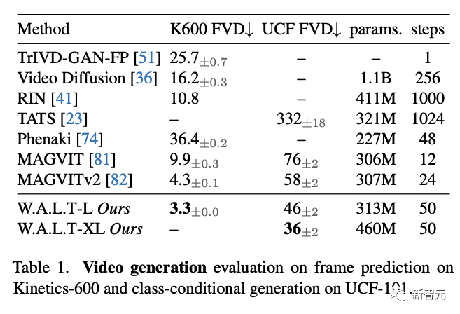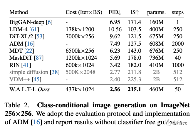 显著优于之前的所有工作(下表1)。https://mmbiz.qpic.cn/sz_mmbiz_png/UicQ7HgWiaUb2W9LbCUDOg2UjG8ibjI9VGVSmN7JlIawXicAqsexU4fdILu4JL2Psib8wcAcrp0LJUOjKVbFJRBe1rg/640?wx_fmt=png&from=appmsg&wxfrom=5&wx_lazy=1&wx_co=1与之前的视频扩散模型相比,研究人员在模型参数更少的情况下实现了最先进的性能,并且需要50个DDIM推理步骤。图像生成为了验证W.A.L.T在图像领域的建模能力,研究人员训练了一个W.A.L.T版本,用于标准的ImageNet类别条件设置。在评估中,研究人员遵循ADM并报告在50K样本上用50个DDIM步骤生成的FID和Inception分数。研究人员将W.A.L.T与256