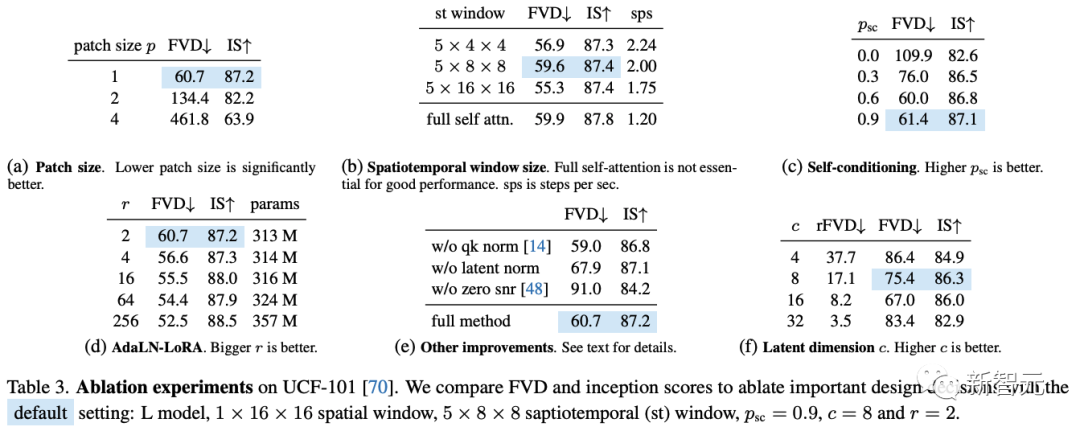 256分辨率的最先进图像生成方法进行比较(下表2)。研究人员的模型在不需要专门的调度、卷积归纳偏见、改进的扩散损失和无分类器指导的情况下优于之前的工作。尽管VDM++的FID分数略有提高,但该模型的参数明显更多(2B)。https://mmbiz.qpic.cn/sz_mmbiz_png/UicQ7HgWiaUb2W9LbCUDOg2UjG8ibjI9VGVwJysQrdsW5LiaVmQ6FkqEHQtbOibZicNbFQkIrDLllbkib8uYINocU1Dibw/640?wx_fmt=png&from=appmsg&wxfrom=5&wx_lazy=1&wx_co=1消融实验在使用ViT