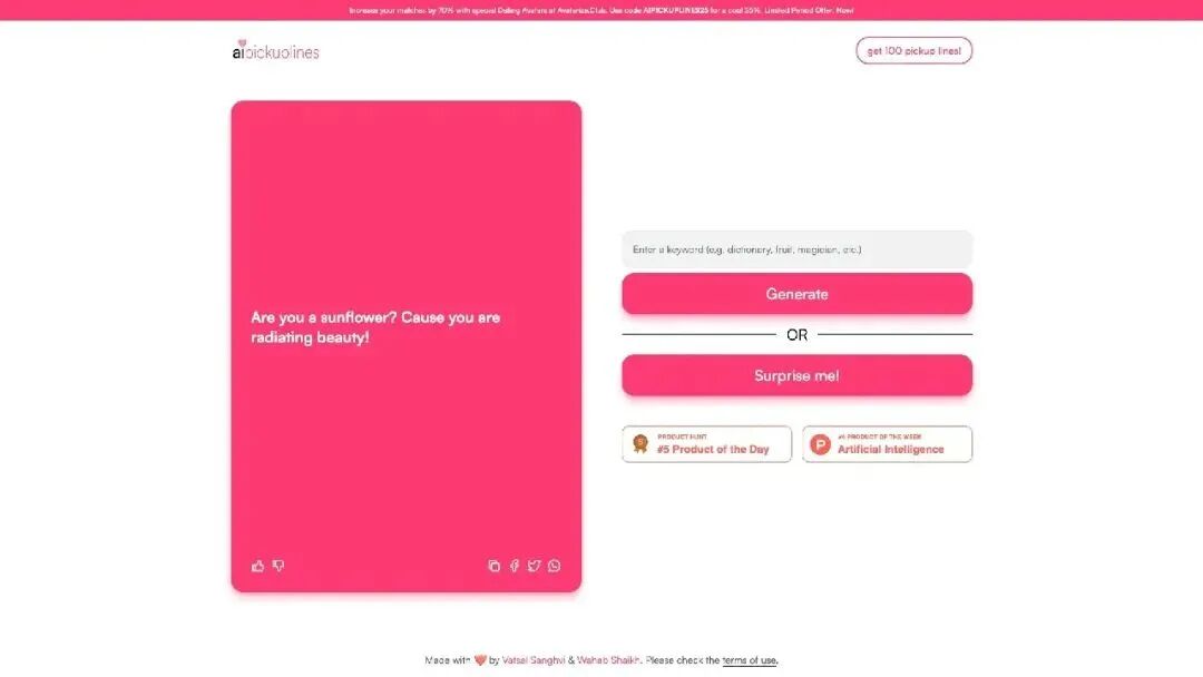 AI Pickup Lines 可以生成各种主题和风格的搭讪开场白,2022 年年底上线,2023 年 3 月初网页就被关闭了。