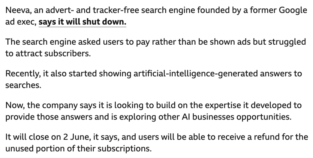 Neeva 是一个人工智能驱动的搜索引擎,主打无广告、优先考虑用户隐私。它由谷歌前高管 Sridhar Ramaswamy 和 Vivek Raghunathan 于 2019 年创立,2023 年 5 月宣布关停,并被 Snowflake 收购。