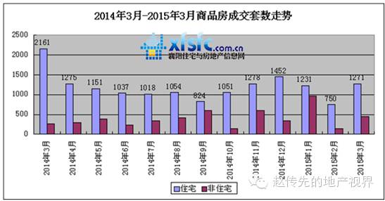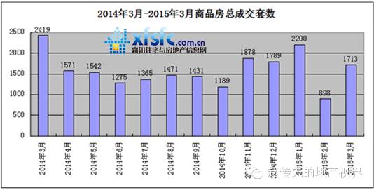 2015年第一季度,襄阳市区商品房入网备案销售总量4780套(不含备案撤销商品房31套),与去年同期相比减少1845套,同比增长-27.84%。2015年1月成交2200套,同比增长2.37%,创去年4月以来商品房销售新高,为今年楼市创下了良好的开端;2月楼市销量受传统春节影响,商品房成交898套,同比增长-53.9%;季末3月市场回暖趋势明显,成交1713套,同比增长-29.19%。