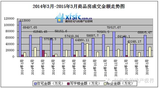 2015年前3月,市区商品房成交面积48.97万方(不含备案撤销商品房31套),同比增长-25.52%,商品房成交面积同比略有减少,但依然超过2013年水平。1月成交20.95万方,环比增加1.4%;2月成交9.92万方;3月成交18.5万方,环比增加86.49%。其中商品住宅成交面积34.86万方,同比增长-37.97%;写字楼成交面积1.38万方,同比增长72.5%;商业营业用房成交12.73万方,同比增长45.82%。住宅成交面积同比减少而非住宅同比出现大幅度增长,表明市民投资方向的转移,也表明我市房地产行业顺应市场发展形势,注重商品房结构调整。