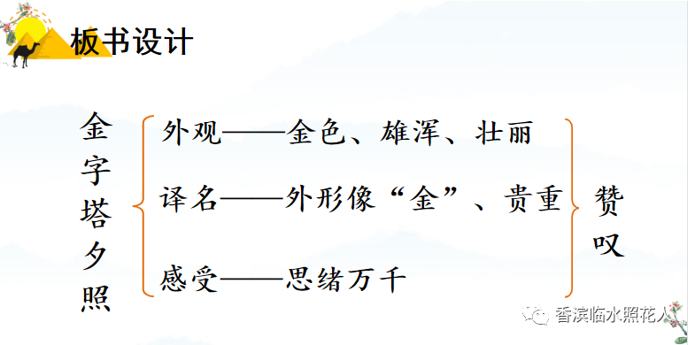 (二)课文学习:顺着短文由远及近的表达顺序,想作者在这幅“开阔而又雄浑的画卷”中看到了什么,“望着这人间的奇迹”想到了什么,边读边想象画面,感受金字塔的壮观美景,体会作者对金字塔的赞美之情。