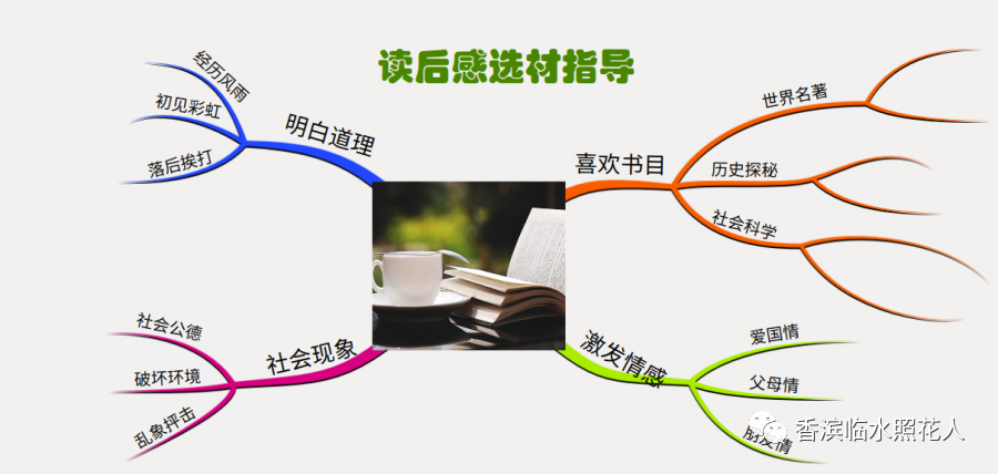 2、通过思维导图的学习,明确读后感的基本要求,帮助学生初步了解写读后感的选材技巧和构思方法。