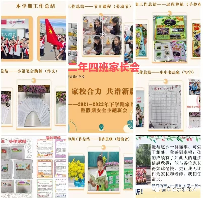 家校合力 共谱新篇——2021-2022年下学期家长会暨假期安全主题班会尊敬的各位家长:大家好!衷心的欢迎并感谢大家如约出席今天的家长会。首先感谢您在百忙之中抽空来参加家长会。关心、帮助、督促孩子健康成长是我们共同的心愿!使您的孩子得到全面发展、提高是我们共同的目标!https://mmbiz.qpic.cn/mmbiz_png/EAg59nDjynDAQIia2XGwsHXibPYIb9ZNsPzICGMMtwO4wZmMk7icD84I1J3UbT1kZgBEibw4cz7tRXqgfrk355ZC6Q/0?wx_fmt=png二、本学期工作总结:二年四班校园生活集锦。播放我制作的二年四班校园生活集锦。家长了解孩子们本学期的校园学习和生活。用图片介绍本学期我们参加的所有学校的活动,以及孩子们的收获。图片分享。1. “学雷锋 向未来”——五个“一”主题系列活动。2. “三八”妇女节主题系列活动。3. “清明节”主题系列活动。4. 勤劳小雷锋 家务小能手。5. 端午节系列活动。6. 远程种植活动。7. 学校劳动实践。8. 书香班级——朗读者。9. 小铅笔会跳舞——作文。10. 小小书法家——写字。https://mmbiz.qpic.cn/mmbiz_png/EAg59nDjynDAQIia2XGwsHXibPYIb9ZNsPSKJpBvEZFoeWyLpCkeQTliaUhQU07pRlsOPqibDicQQBfBjQ1vtCa7OaQ/0?wx_fmt=png多数学生非常懂事、听话,在个人良好习惯养成方面取得了很大的进步。班内同学团结友爱,互帮互助,形成了良好的班风。学生学习多数比较认真、努力,形成了良好的学风。小学阶段尤其是低年级阶段,正是进行良好行为习惯培养的关键时期,很多孩子学习成绩不稳定,主要是没有养成良好的习惯。对于90%的学生来说,学习的好坏,智力因素只占20%,非智力因素占80%。在信心、意志、习惯、兴趣、性格这些非智力因素中,性格又占据着十分重要的位置。平时教学的侧重点:1. 语文侧重书写和小练笔(耐心)2.数学侧重计算(细心)学生的课堂节奏:上课认真听讲,积极参与课上学习,做好笔记。注重培养孩子良好的学习习惯,逐步带学生做好每一次考试后的成绩分析。https://mmbiz.qpic.cn/mmbiz_png/EAg59nDjynDAQIia2XGwsHXibPYIb9ZNsPs2e75ZwfLshXKwHOxIJ0kia9iav3Gib0eKCRSARF0us7KhLK3uNetK9mQ/0?wx_fmt=png四、给家长的建议:“没赶上公交车没关系,但一定要赶上孩子的未来。”广州街头一处公交车站广告牌上的标语,让作为师者的我感慨颇多。没赶上公交车没关系,但一定要赶上孩子的成长!孩子成长的黄金期就这么几年,一些优秀的学习品质,良好的生活习惯都是在这几年培养起来的,错过了就错过了,没有办法补救。1、如何做好假期的陪伴1.养成良好的作业习惯,制定假期学习计划表。贪玩是孩子的天性,大多数孩子缺少自我控制能力,所以需要家长们平时多督促孩子认真完成家庭作业,培养他们良好的作业习惯,写字姿势。2.养成良好的学习方法。孩子完成作业时要采取这样的方法:按照计划完成一天的学习计划,逐条在今日计划本上标示出等级。然后家长对作业进行抽查,做出相应的评价。3.养成想想再问的习惯。有些题目孩子不懂,家长要耐心地解释题目的意思,鼓励孩子不懂就问。还要鼓励孩子想想再问。4.养成良好的阅读习惯。我们要让学生静得下,帮助学生养成每天阅读的习惯,扩大他们的知识面。家长也需要规律地作息。5. 做孩子成长的领路人。https://mmbiz.qpic.cn/mmbiz_png/EAg59nDjynDAQIia2XGwsHXibPYIb9ZNsPIqe9iaGlff3rkRQKBXSicnJIicYwxHg5uQicBPFkXnDwiaxfo8OshpZt14Q/0?wx_fmt=png我的建议:1.家长对孩子的作业每天检查,发现有问题之处 请帮助孩子弄懂,督促孩子订正,然后签字。每天听写孩子生字。检查口算作业。预习作业让孩子熟读课文,帮助收集一些资料。2.错题本及时整理。把卷子,书上的错题抄下来,让孩子重做,发现此类型题孩子有问题也可记录上去,并定时把这些错题,重新做一做。3.特色作业仍然要求家长们配合完成。图文结合。我们要注重孩子的小练笔作业,这是提高孩子语文成绩的最好方法。有些优秀作业还需要家长帮我打出来,发给我传到博客上去,给孩子们积累起来,激发他们学习的积极性。4.指导孩子多读书,希望家长也多读一些书:要培养孩子的书卷气,必须靠家庭的书香气。我主张亲子阅读, 家长和孩子一起读书效果很好。如果能和孩子一起写日记那就更好。https://mmbiz.qpic.cn/mmbiz_png/EAg59nDjynDAQIia2XGwsHXibPYIb9ZNsPObEkHV6nR4nep5kH6HUmCiaOxbY80c9Fia3C2bMx3H63ibWHLnmcic99qg/0?wx_fmt=png我推荐几本书:卢勤 《把孩子培养成财富》、《做最好的家长》等,有人说, 孩子们的竞争就是家长间的竞争。针对孩子的情况,及时和老师联系,及时沟通。我觉得在教育孩子的问题上,首先要了解学生,在此基础上家长和老师们携起手来,把工作做到学生的心坎上,做到真正有效果。希望家长们多和我们联系,一方面可以使自己的教育更具有针对性;另一方面,也可以对孩子形成一种前进的动力。联系的方式很多,你们可以选择自己觉得方便的方式。https://mmbiz.qpic.cn/mmbiz_png/EAg59nDjynDAQIia2XGwsHXibPYIb9ZNsPIXKsyvMl2J1PznZOjCmicbo9QUhWO6IBRvCnrF5aOeQRCFWzbYzKo5A/0?wx_fmt=png