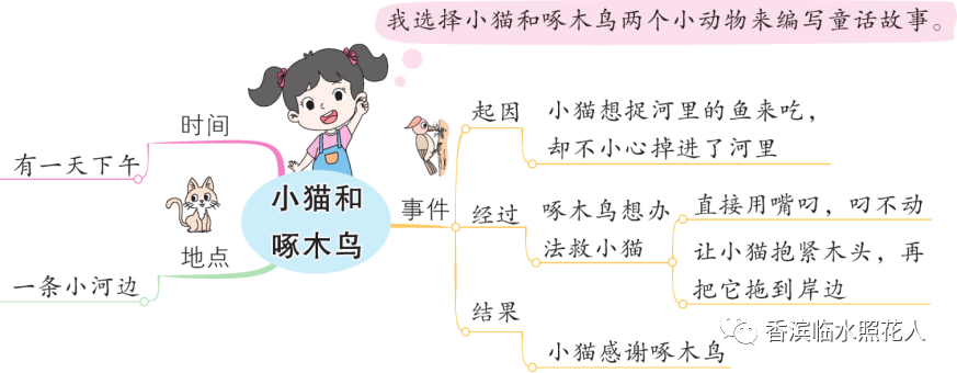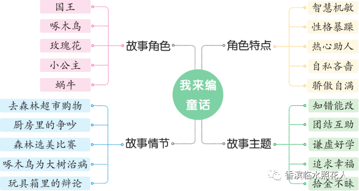 1.根据给出的词语编写童话故事,发挥丰富的想象力,交代清楚故事的起因、经过、结果。