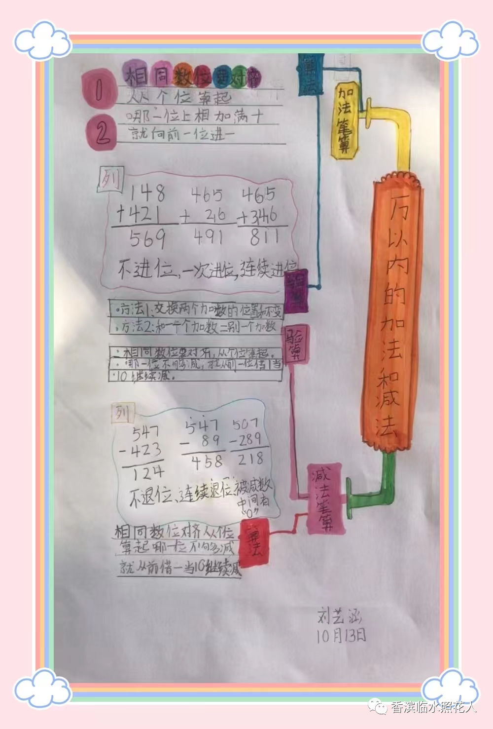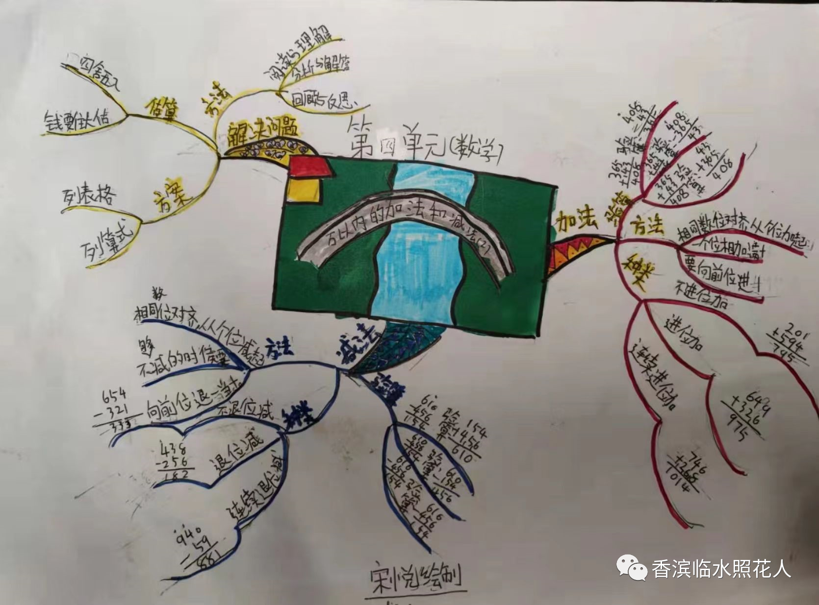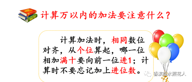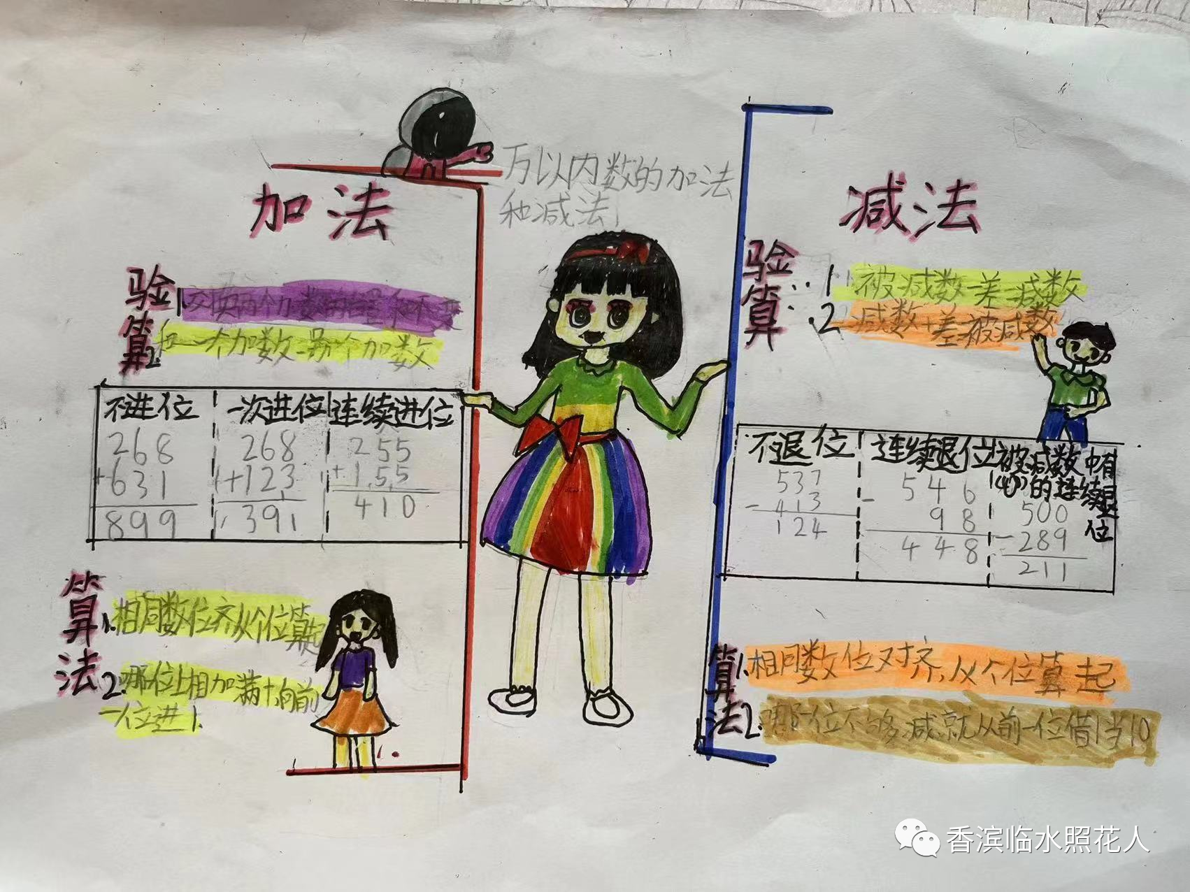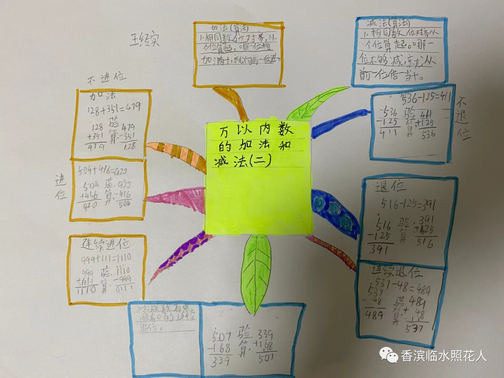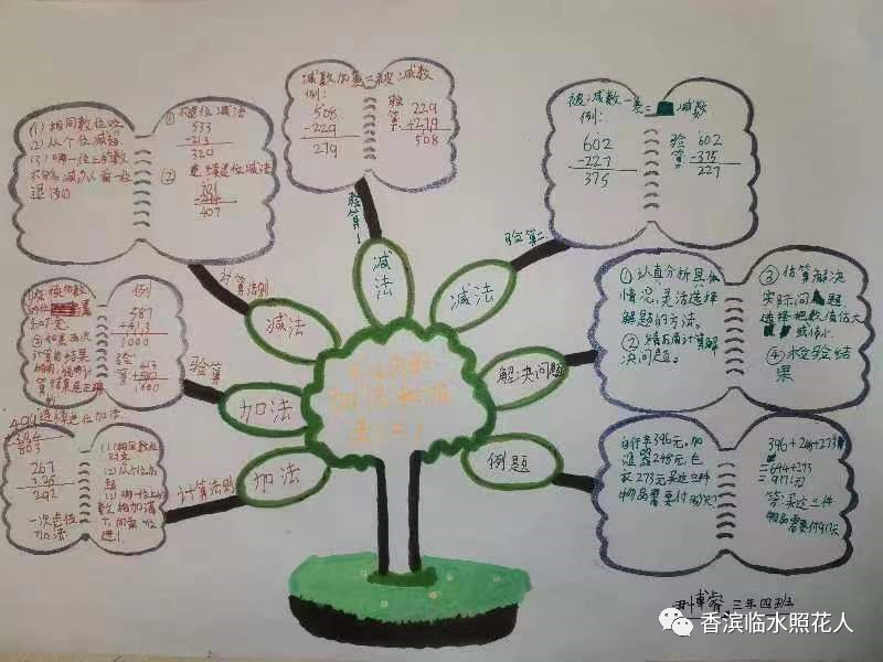 7、笔算加减法时:相同数位要对齐;从个位算起。哪一位上的数相加满10,就向前一位进1;哪一位上的数不够减,就从前一位退1当作10,加本位再减;如果前一位是0,则再从前一位退1。(两个三位数相加的和:可能是三位数,也有可能是四位数。)