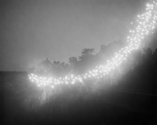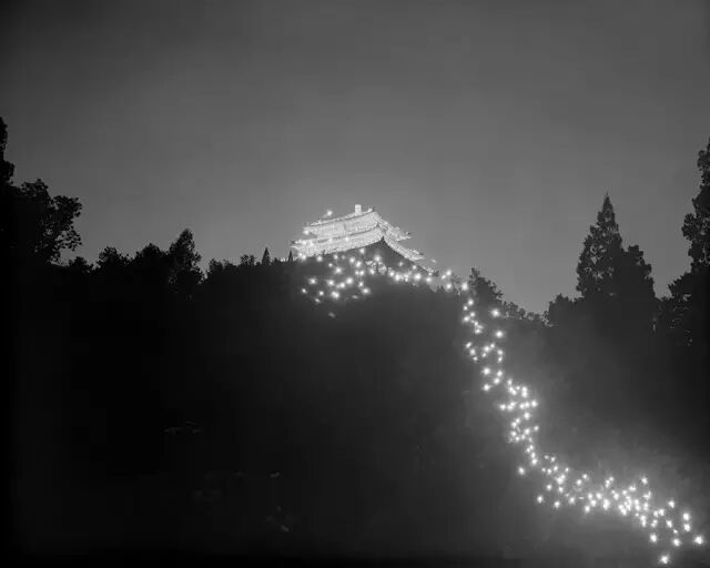 景山,望春亭。几根柱子撑起雕檐拱顶,周围黑漆漆的,建筑本身微弱的光被湮没在暗夜。星星一样的光团沿着台阶洒下来,延伸到苍茫的古树尽头。