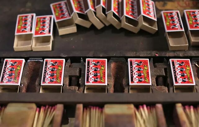 然后把筛选出来的火柴梗整整齐齐插在机器上的孔里,随着传送带的运转,火柴头被涂上红红绿绿的由氯酸钾、二氧化锰、硫磺等混合成的黏稠的药水。等把药水烘干,再进行装盒、封盒、刷磷片、包装、贴标签等一系列步骤,一盒火柴就诞生了。